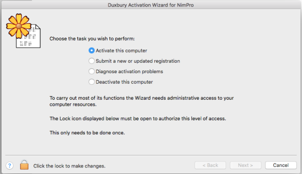The activation wizard serves both the Duxbury Braille Translator and NimPro. If you have used it for one program, you will find it familiar and easy to use with the other.