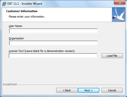 Leave the License Text field blank if you are installing a demonstration version of DBT. You'll be given the chance to supply your License Text after DBT is installed and running, should you decide that you wish to purchase a license.