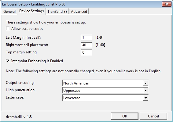 Allow escape codes - checking the "Allow escape codes" check box allows you to temporarily override some of your embosser settings using the settings from Document: Embosser Setup (Ctrl-F11).
