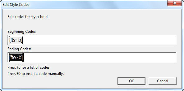 b) press F9, in which case a pair of brackets will appear with the cursor between them. Again simply type the fts~b code. (If you need to add an additional code, make sure your cursor does not remain inside an existing code.