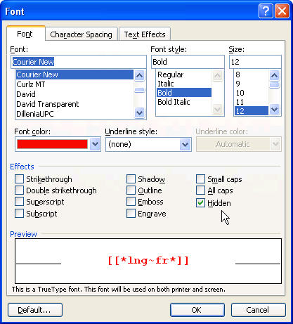 Next, a word Character Style was created (We called it "Braille Code"). In this example, we have chosen a 12 point Courier New Bold Font, colored red to make it stand out in our text. We have also checked "Hidden" under Font effects. (Click here to see Word's Format: Font dialog for this example.)